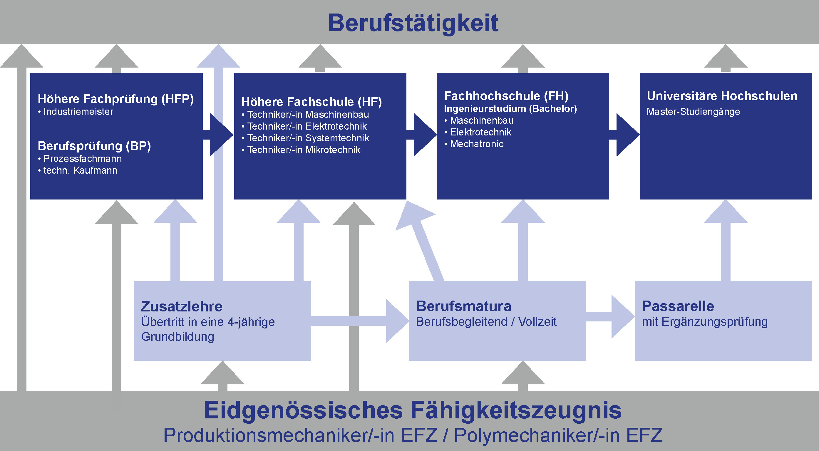 Nach der Ausbildung zum Polymechaniker oder Produktionsmechaniker kann der Weiterbildungsweg an der höheren Fachschule fortgeführt werden. Als höhere Berufsbildung sind auch die eidg. Berufs- und höheren Fachprüfungen eine Auswahlmöglichkeit.